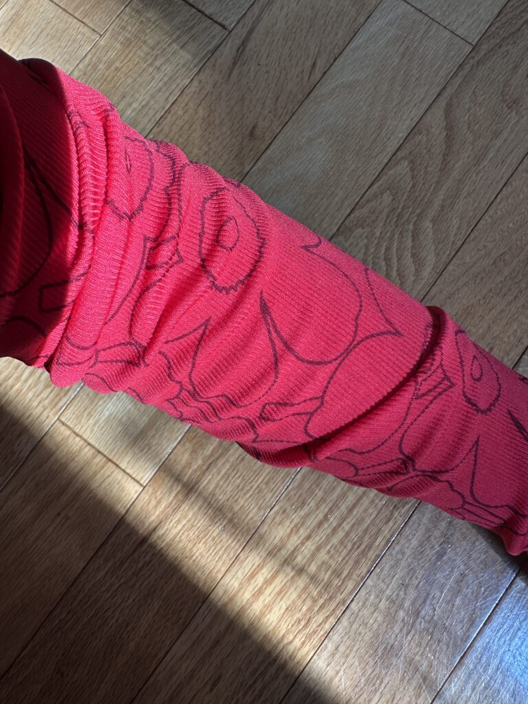 地元の商業施設で赤のぴったりしたハイネック(コットンメイン・約1万5千円)を買っていました🤣